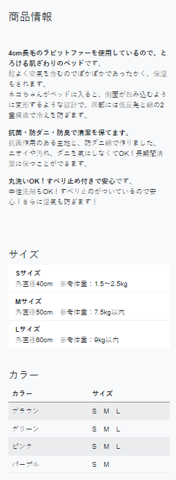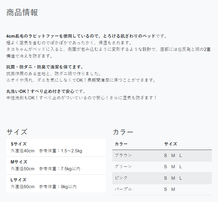 <div class="container-fluid bg-light p-5"> <h2 class="py-5">商品情報</h2> <p><strong>4cm長毛のラビットファーを使用しているので、とろける肌ざわりのベッド</strong>です。<br>程よく空気を含むのでぽかぽかであったかく、保湿もされます。<br>ネコちゃんがベッドに入ると、側面が包み込むように変形するような設計で、底部には低反発と綿の2重構造で冷えを防ぎます。</p> <p><strong>抗菌・防ダニ・防臭で清潔を保てます。</strong><br>抗菌作用のある生地と、防ダニ綿で作りました。<br>ニオイや汚れ、ダニを気にしなくてOK!長期間清潔に保つことができます。</p> <p><strong>丸洗いOK!すべり止め付きで安心</strong>です。<br>中性洗剤もOK!すべり止めがついているので安心!さらに湿気も防ぎます!</p> </div>